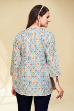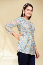 The Neckline: A classic notched V-neckline with a decorative button placket that adds a touch of sophistication.