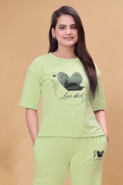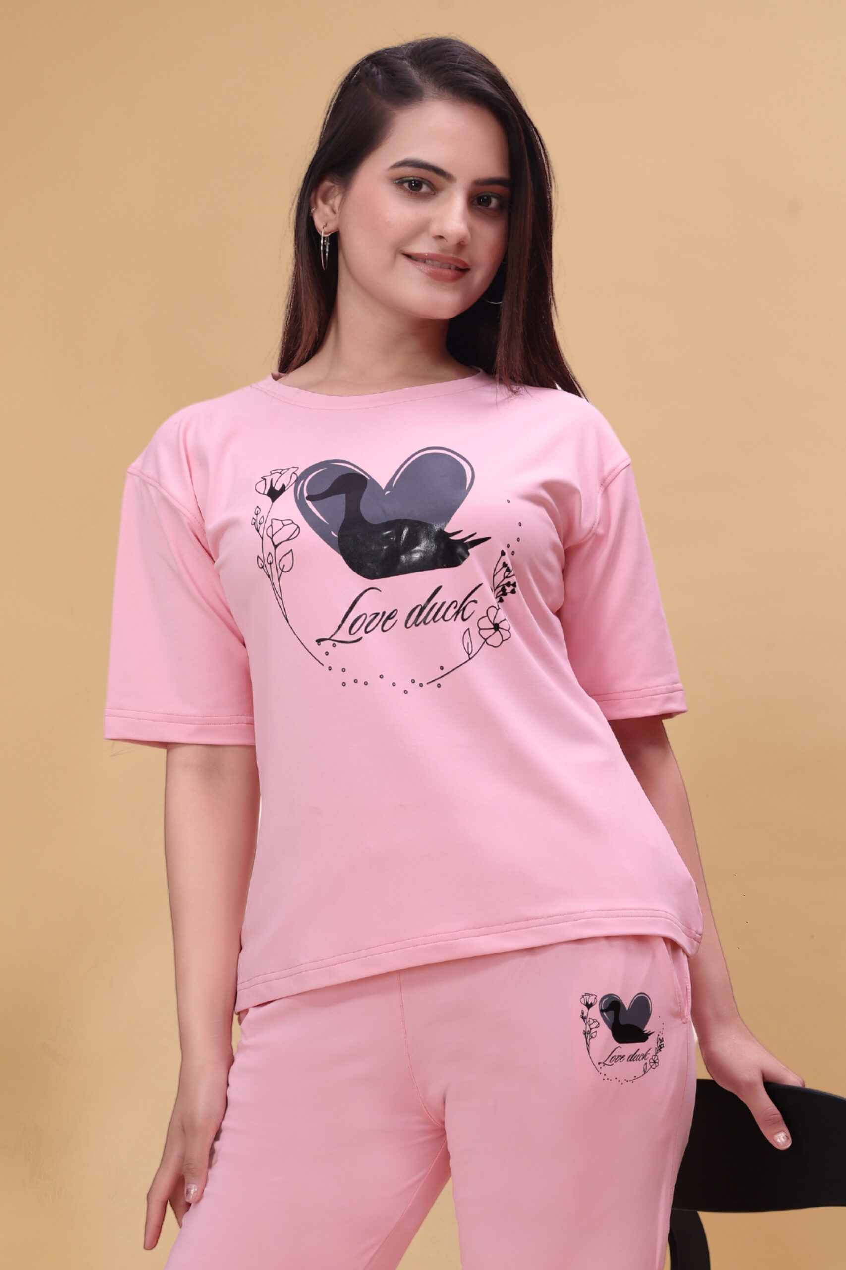 Charming Graphic Design: The set features a playful heart and duck silhouette motif on the chest, accented with delicate floral vine detailing and “Love Duck” script. A matching mini-graphic is featured on the upper thigh of the trousers.