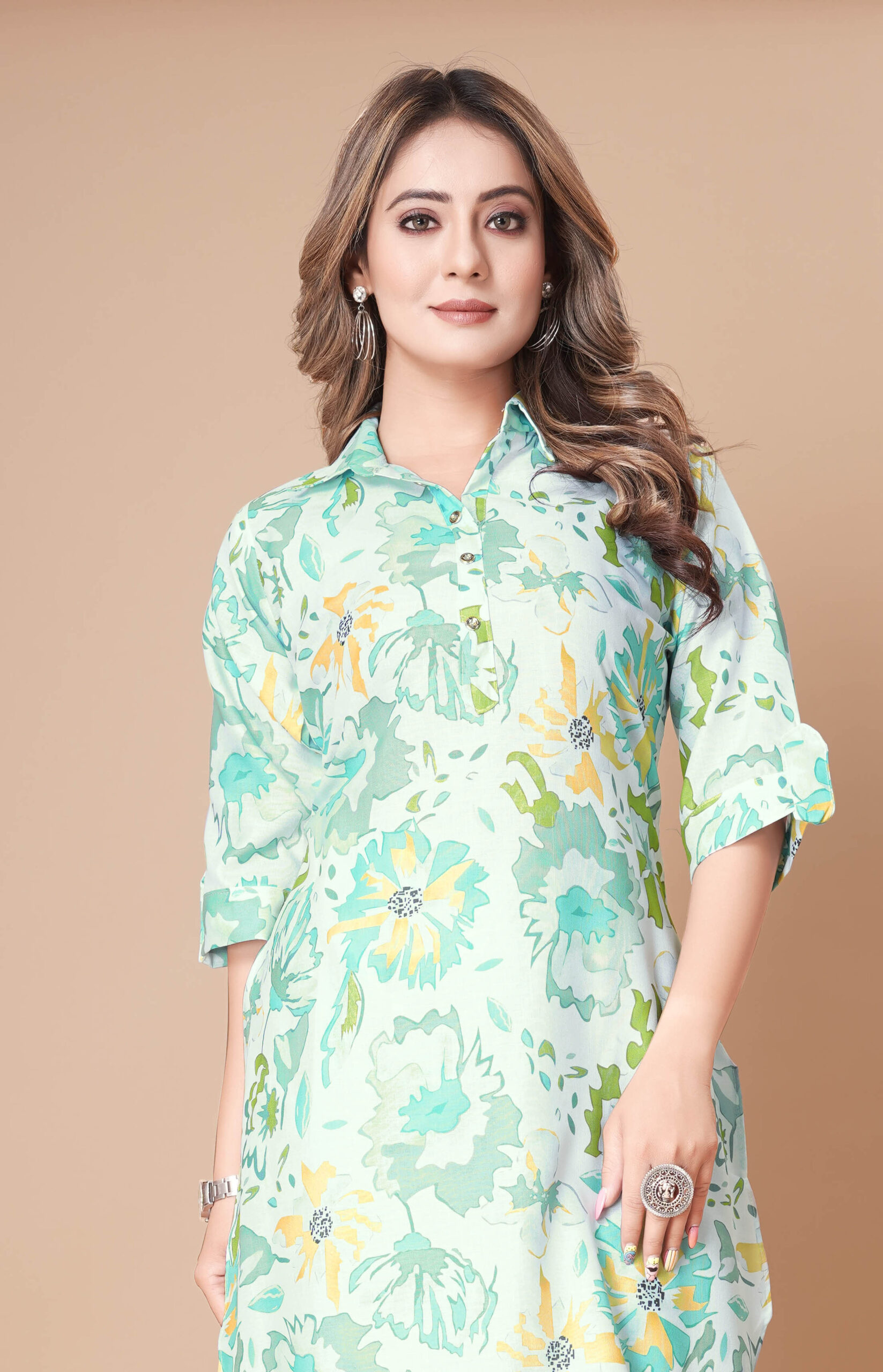 he Tunic: A flattering longline silhouette featuring a classic shirt collar and a button-down placket. The mid-length sleeves offer a relaxed yet refined feel.