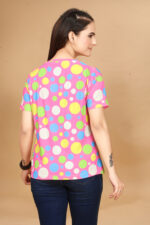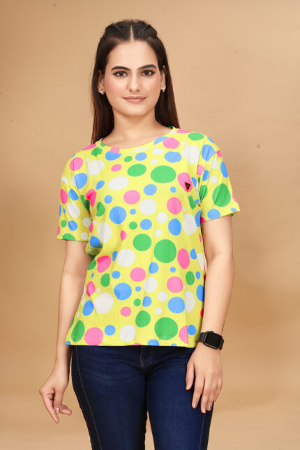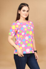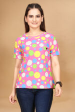 Add a splash of color to your casual wardrobe with our Vibrant Polka Dot Ribbed Top. Featuring a bold mix of multi-colored oversized dots on a striking candy-pink base, this tee is designed for those who love to stand out.