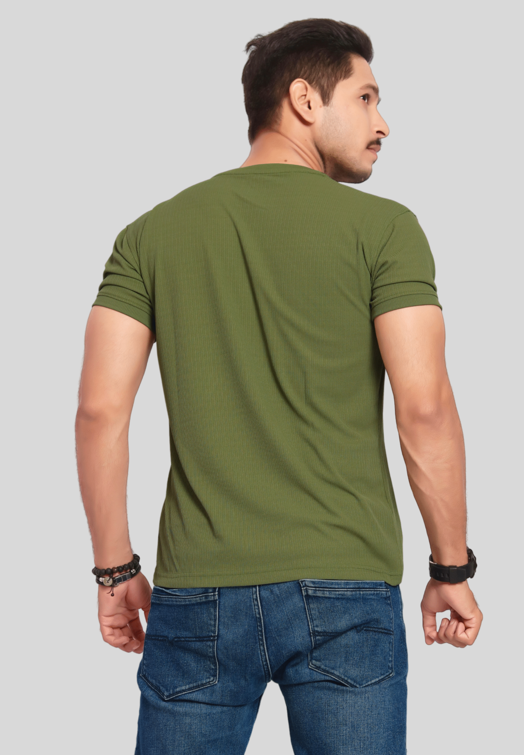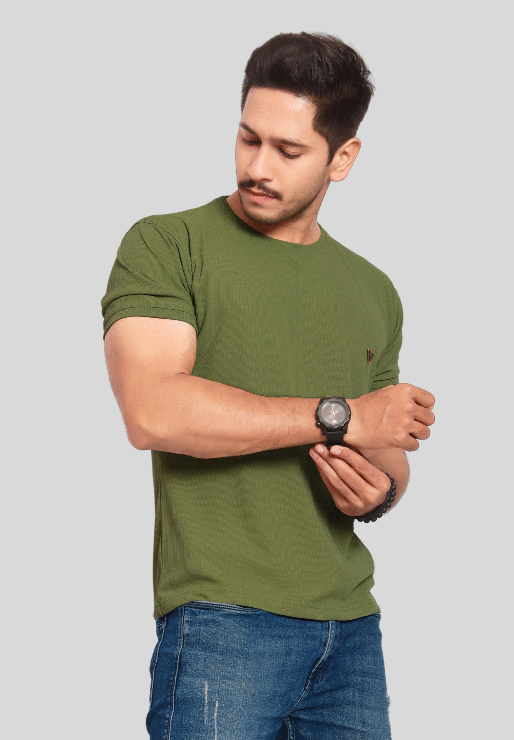 Upgrade your casual wardrobe with this stylish dark Green Ribbed T-Shirt for men. Crafted from a soft, breathable cotton-blend fabric, this t-shirt ensures all-day comfort and ease of movement. The subtle ribbed texture adds a modern touch, while the classic crew neckline and short sleeves provide a timeless silhouette. Featuring a minimal triangle logo on the chest, this tee is perfect for both everyday wear and relaxed outings. Pair it effortlessly with jeans or joggers for a cool, laid-back look.