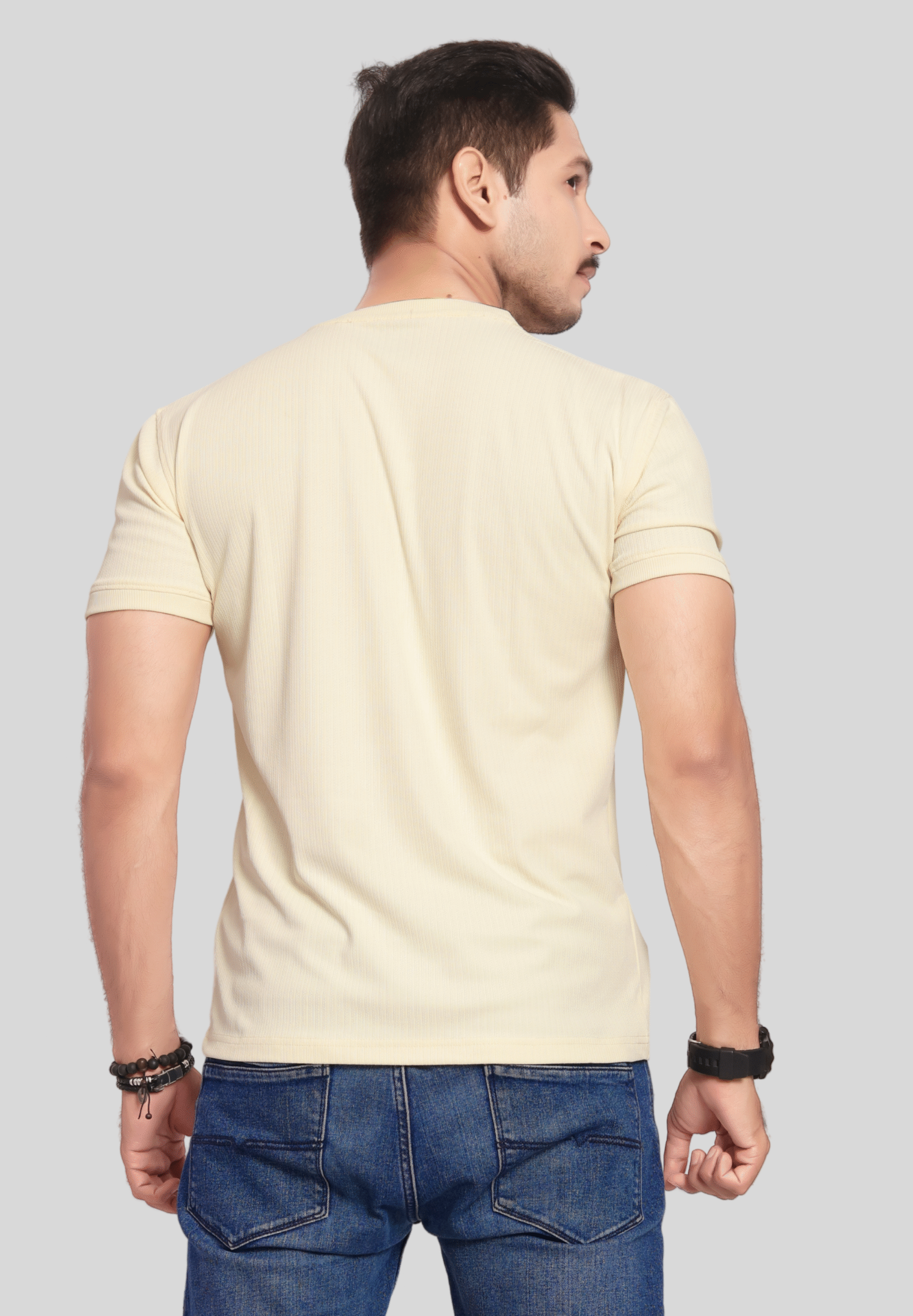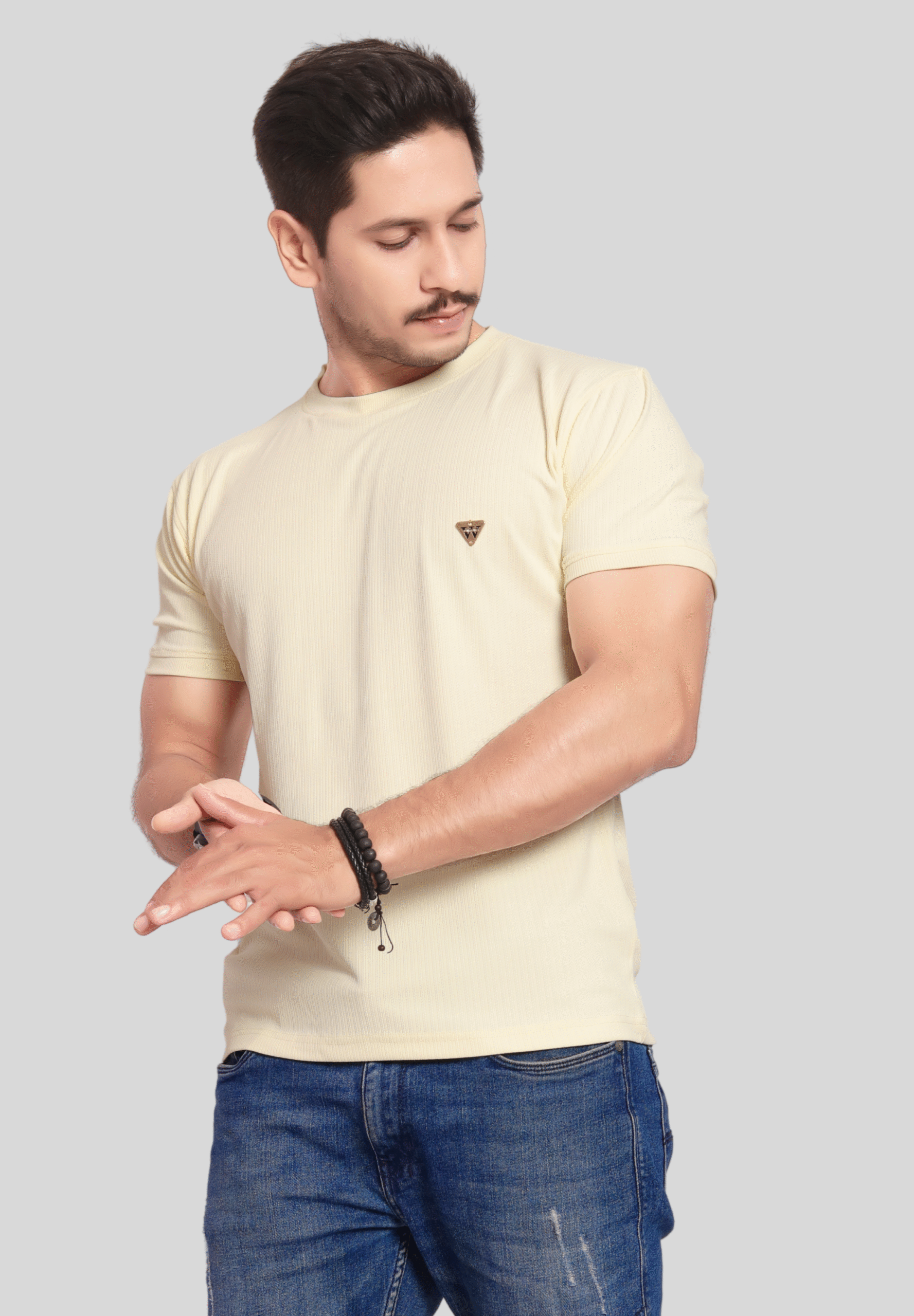 Upgrade your casual wardrobe with this stylish Light Green Ribbed T-Shirt for men. Crafted from a soft, breathable cotton-blend fabric, this t-shirt ensures all-day comfort and ease of movement. The subtle ribbed texture adds a modern touch, while the classic crew neckline and short sleeves provide a timeless silhouette. Featuring a minimal triangle logo on the chest, this tee is perfect for both everyday wear and relaxed outings. Pair it effortlessly with jeans or joggers for a cool, laid-back look.