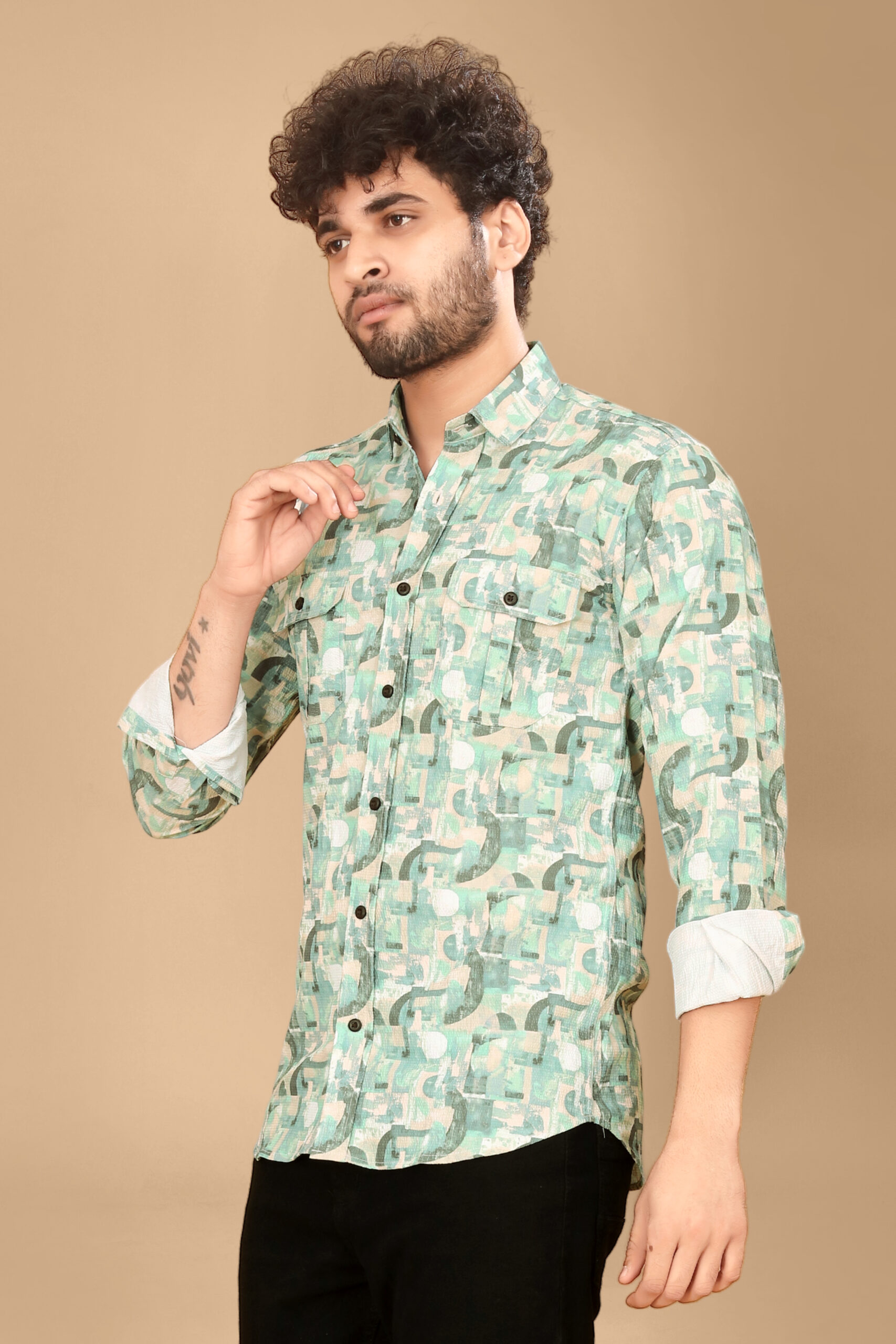 Elevate your everyday style with our Artisan Abstract Geometric Shirt. This piece features a sophisticated, multi-tonal grid pattern in shades of sage green, pale yellow, and charcoal, layered over a textured cream base. It’s the perfect blend of contemporary art and classic tailoring.