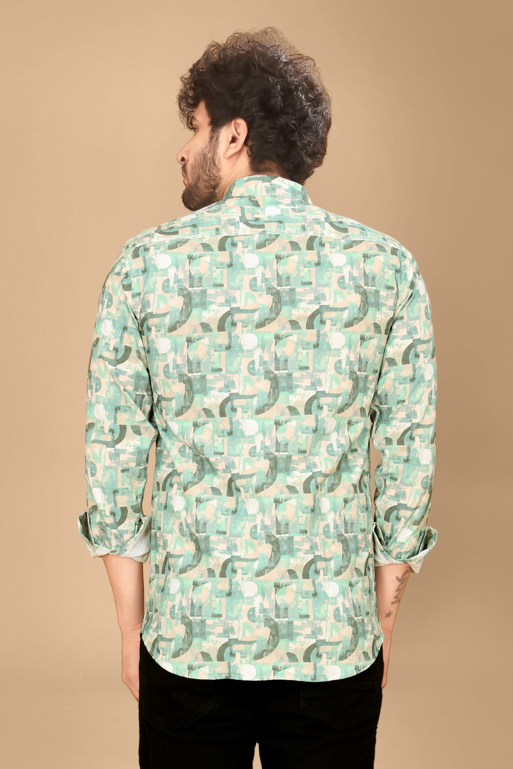 This is a really distinctive piece! The geometric, abstract pattern gives it a modern, artistic edge that sets it apart from a standard button-down.
