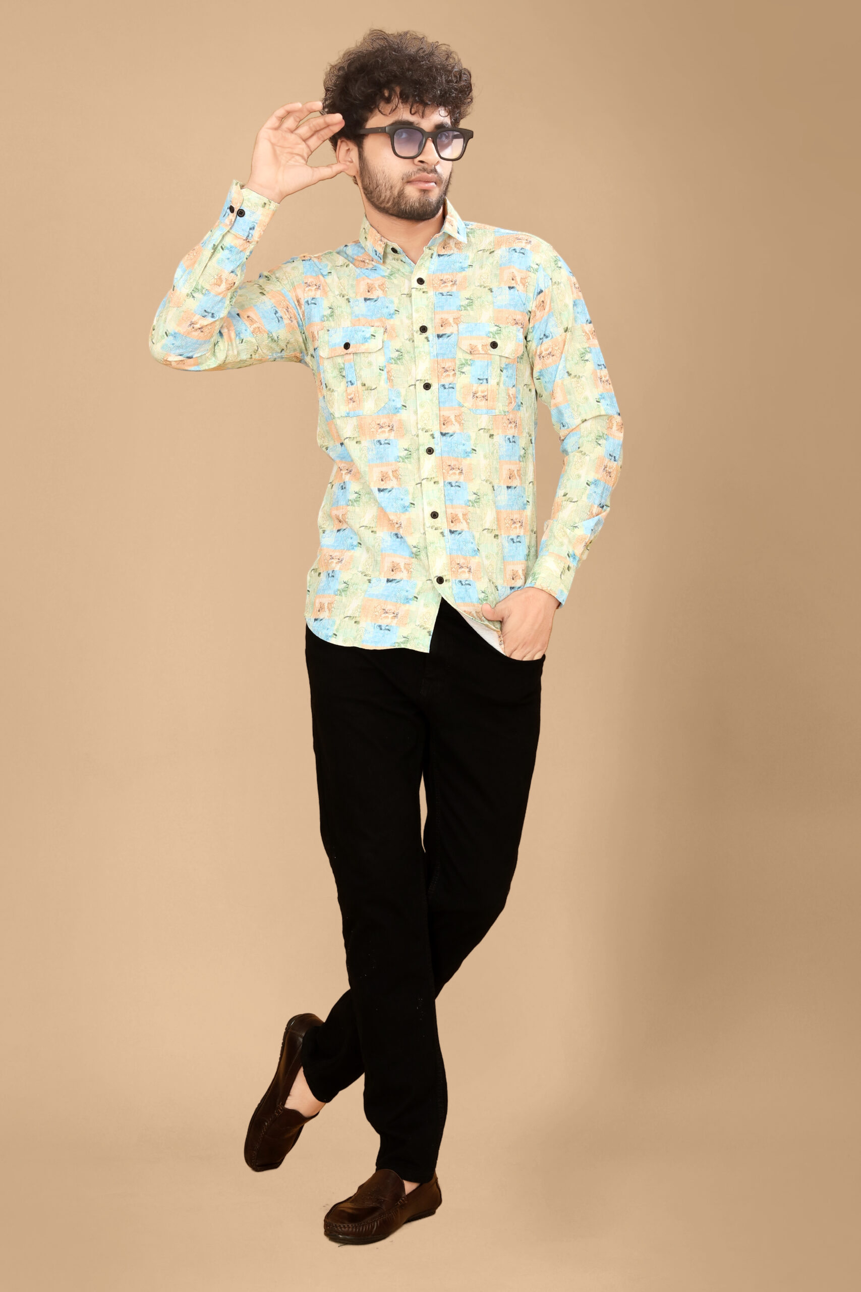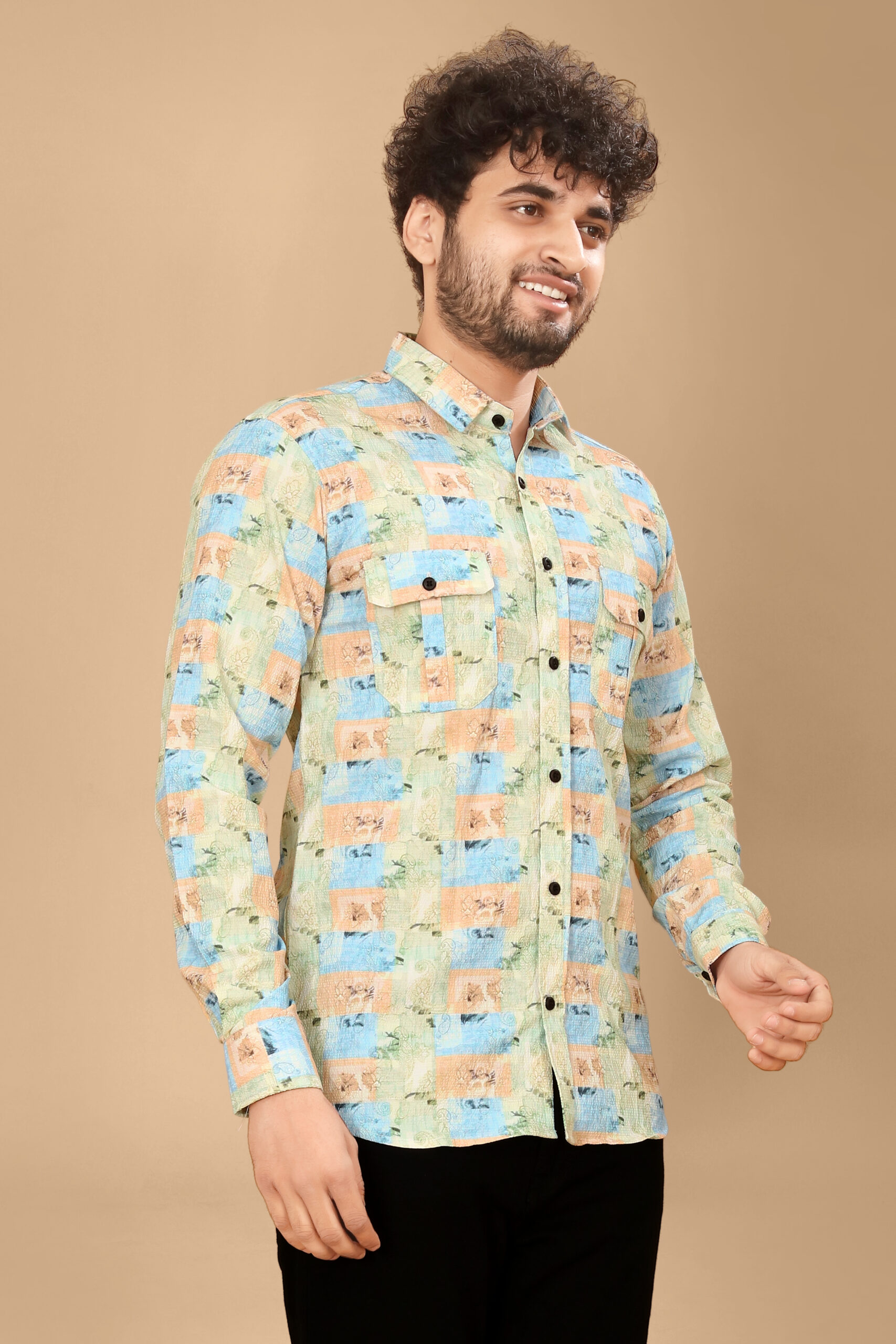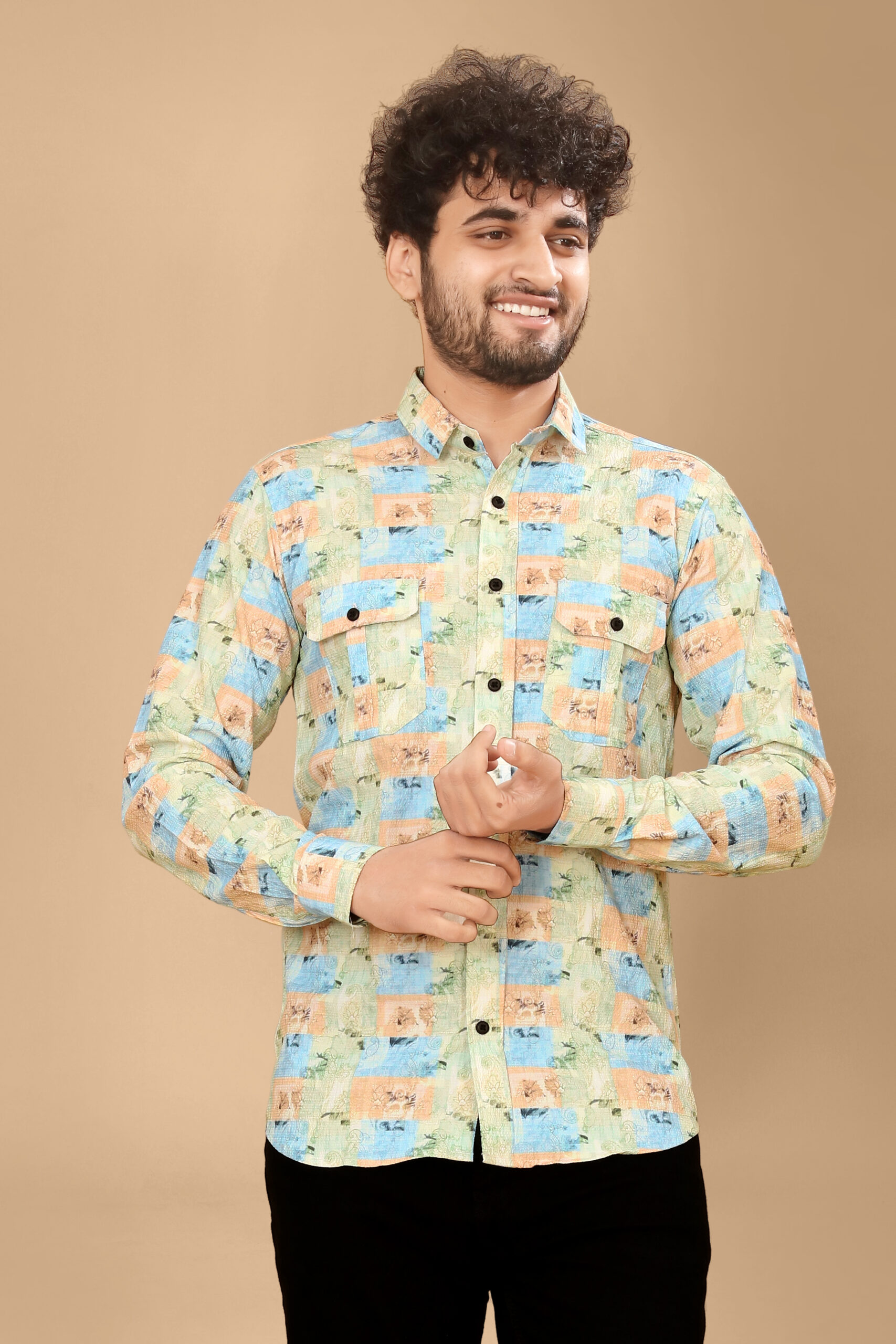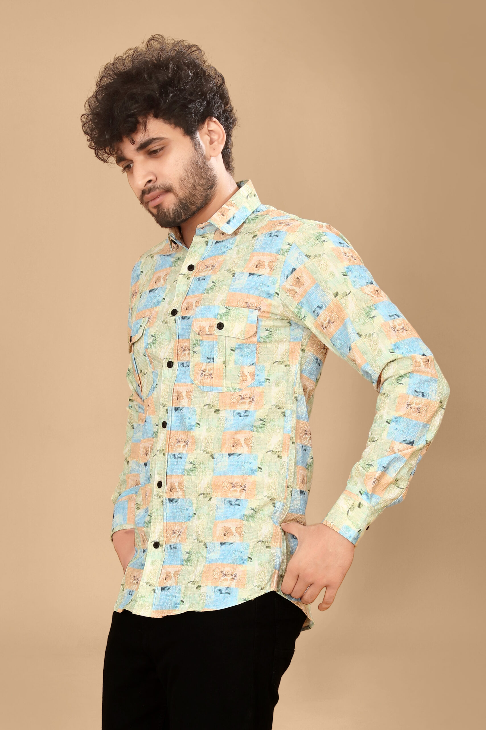 Elevate your everyday style with our Artisan Abstract Geometric Shirt. This piece features a sophisticated, multi-tonal grid pattern in shades of sage green, pale yellow, and charcoal, layered over a textured cream base. It’s the perfect blend of contemporary art and classic tailoring.