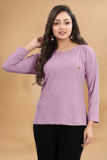 Elevate your casual look with this stylish lavender ribbed knit T-shirt. Designed for comfort and everyday wear, this T-shirt features a soft, stretchable fabric that feels gentle on the skin. The full sleeves and round neckline offer a timeless silhouette, while the subtle metallic logo badge on the chest adds a touch of elegance. Pair it with jeans, jeggings, or skirts for a versatile and chic ensemble.
