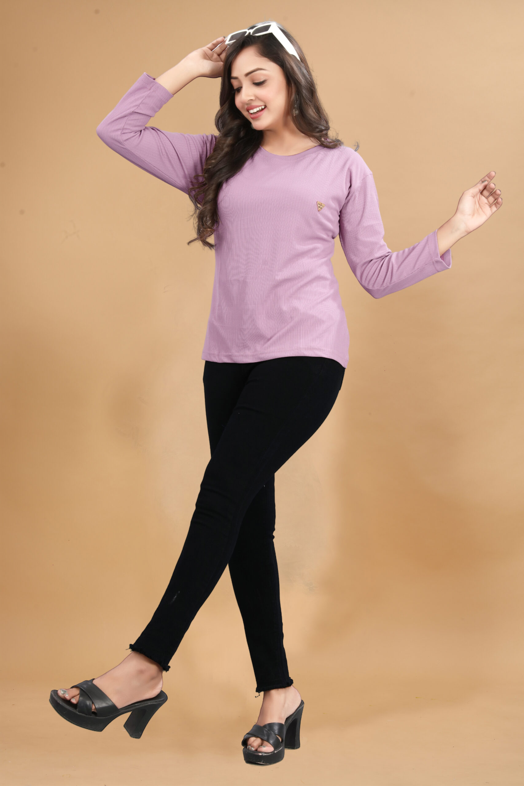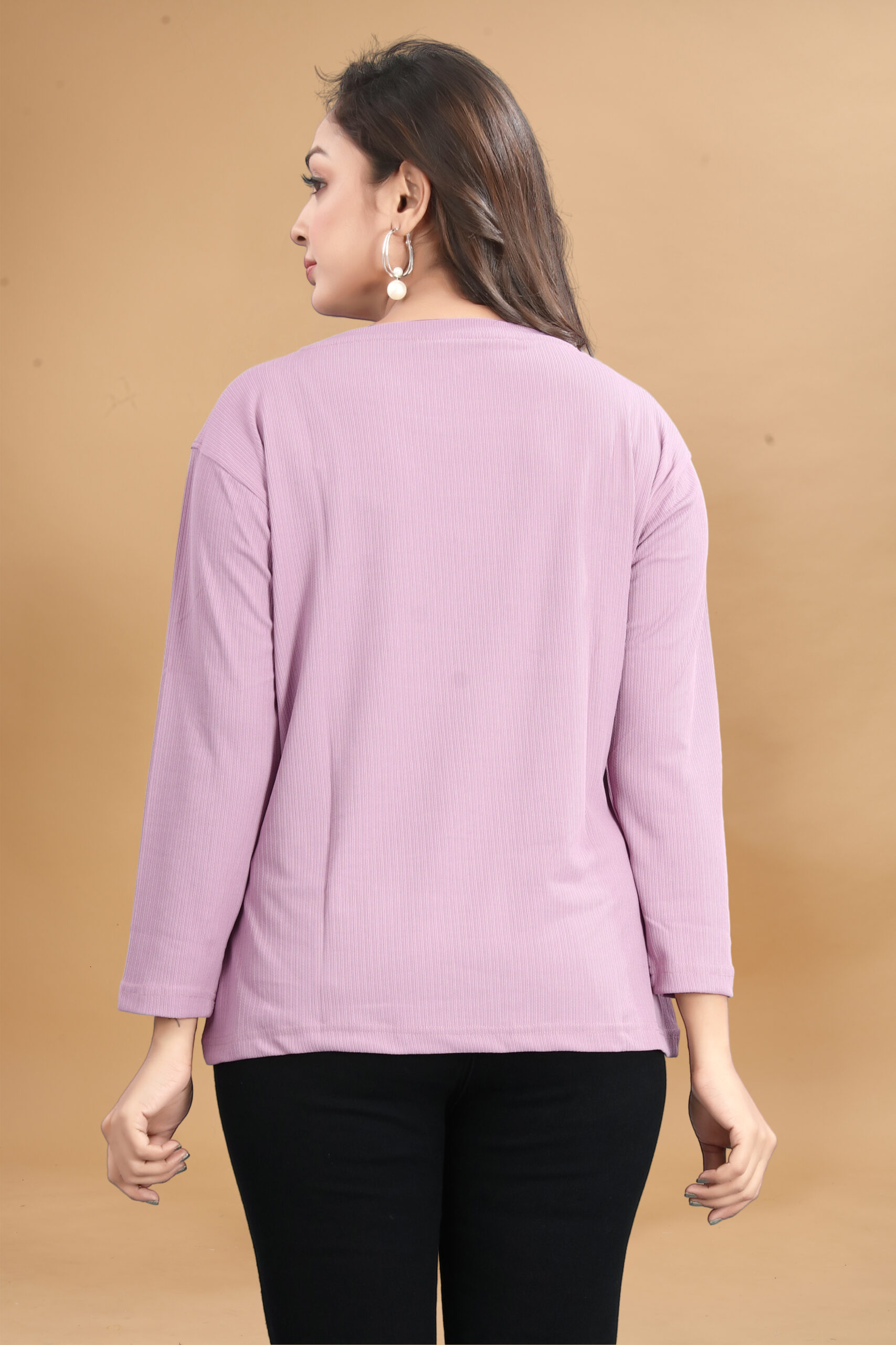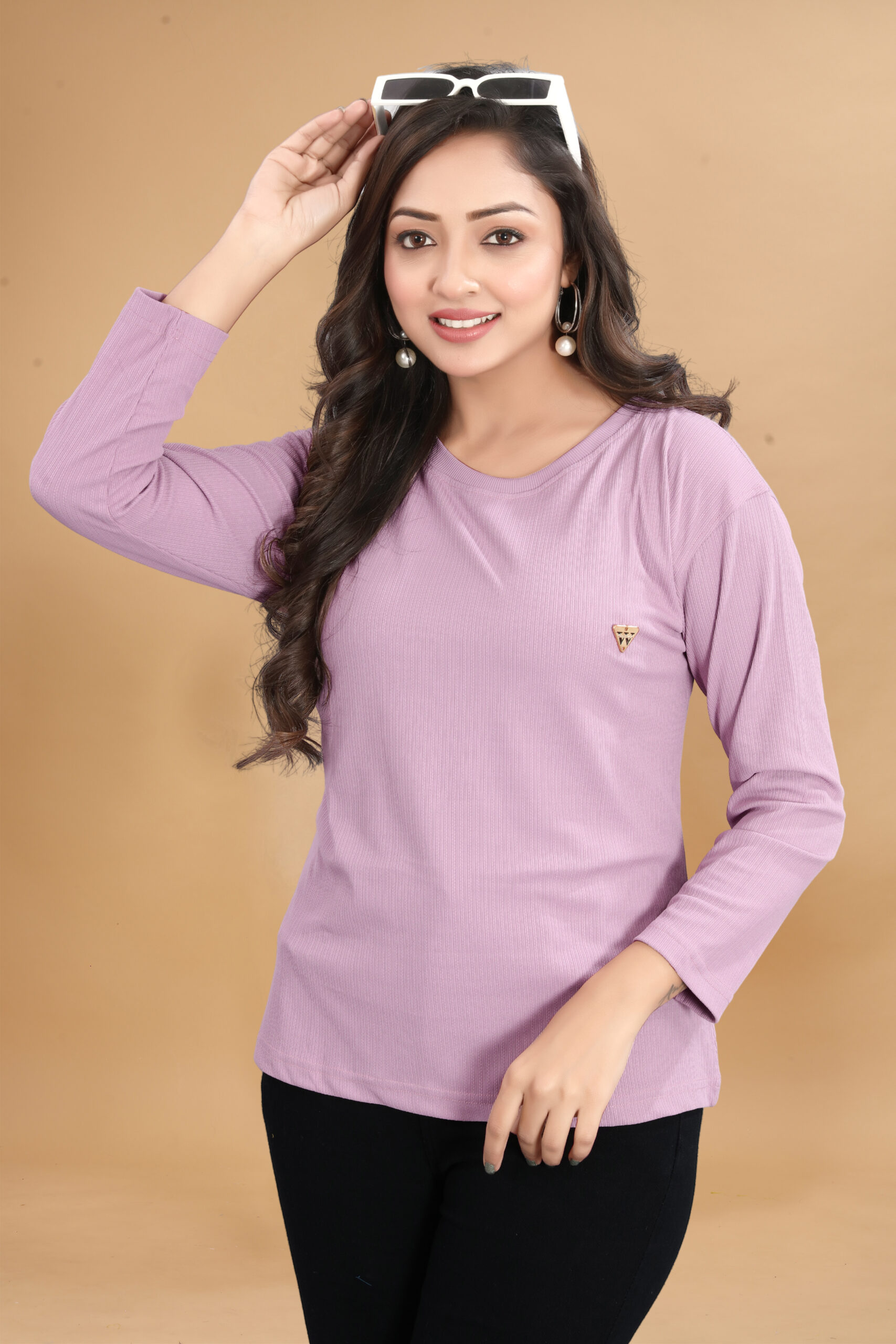 Elevate your casual look with this stylish lavender ribbed knit T-shirt. Designed for comfort and everyday wear, this T-shirt features a soft, stretchable fabric that feels gentle on the skin. The full sleeves and round neckline offer a timeless silhouette, while the subtle metallic logo badge on the chest adds a touch of elegance. Pair it with jeans, jeggings, or skirts for a versatile and chic ensemble.