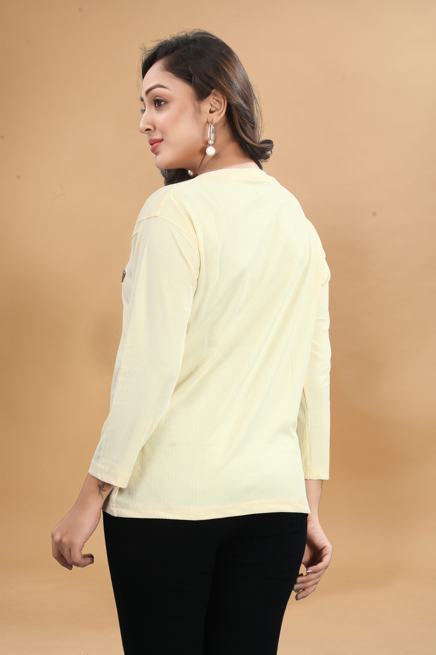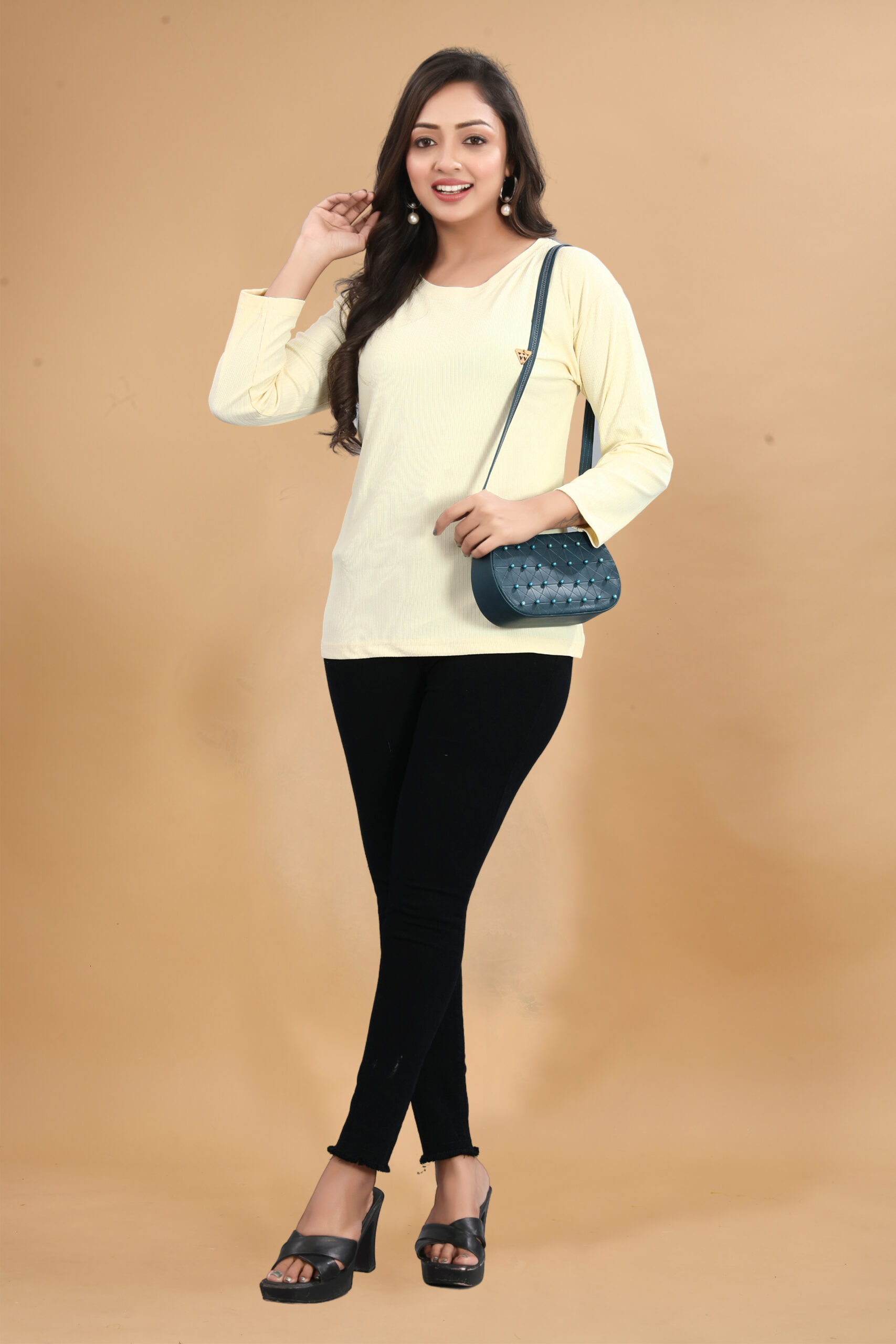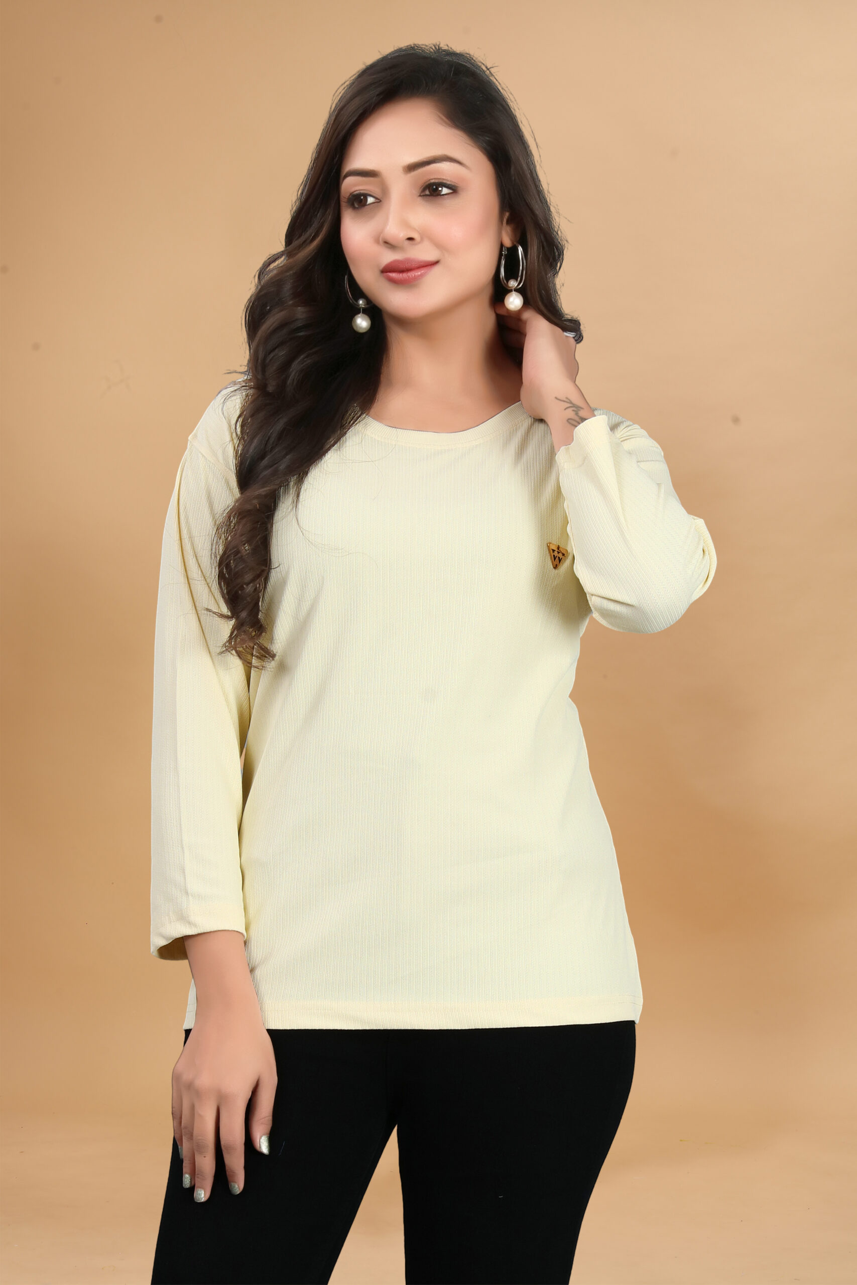 Elevate your casual look with this stylish lavender ribbed knit T-shirt. Designed for comfort and everyday wear, this T-shirt features a soft, stretchable fabric that feels gentle on the skin. The full sleeves and round neckline offer a timeless silhouette, while the subtle metallic logo badge on the chest adds a touch of elegance. Pair it with jeans, jeggings, or skirts for a versatile and chic ensemble.