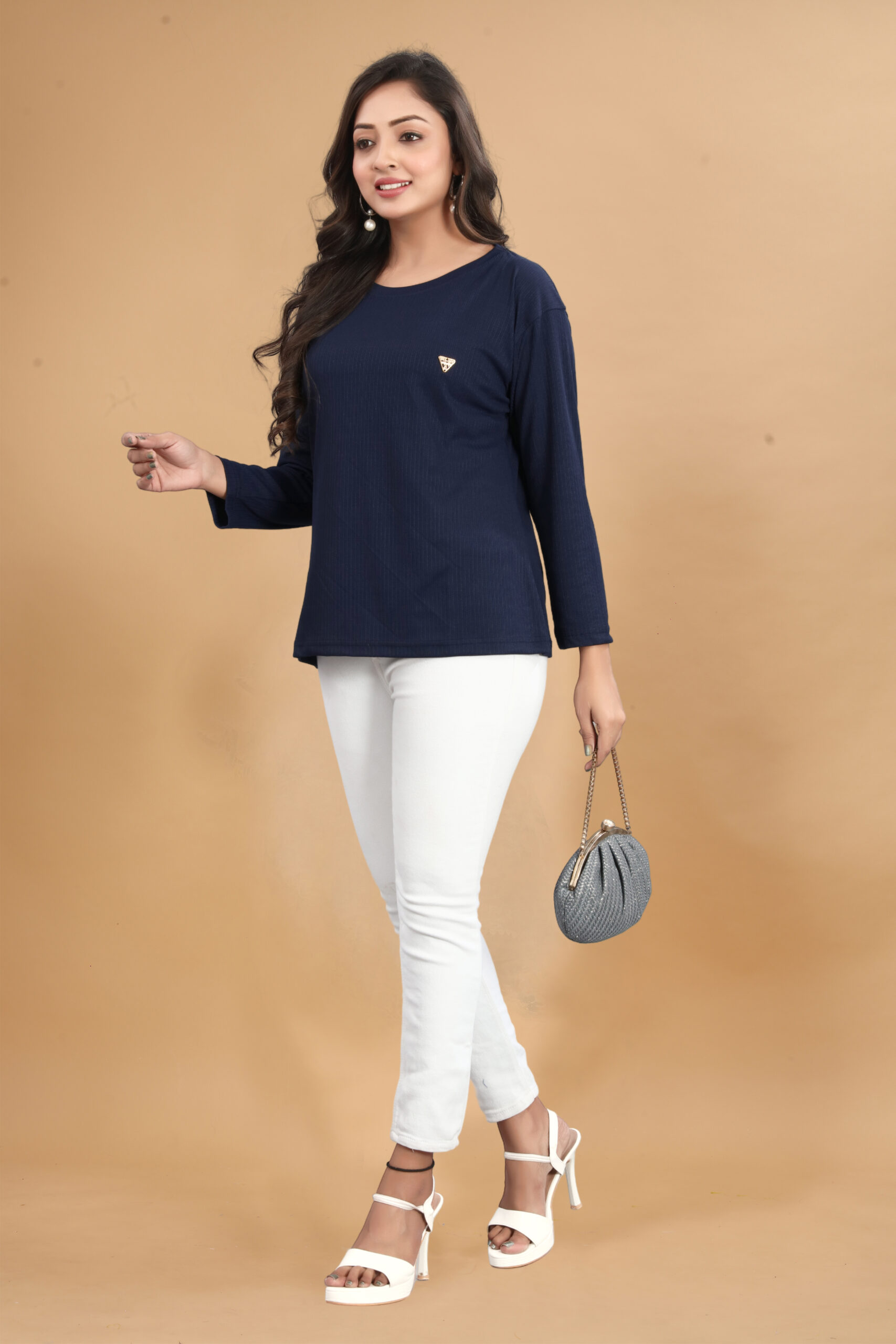 Elevate your casual look with this stylish lavender ribbed knit T-shirt. Designed for comfort and everyday wear, this T-shirt features a soft, stretchable fabric that feels gentle on the skin. The full sleeves and round neckline offer a timeless silhouette, while the subtle metallic logo badge on the chest adds a touch of elegance. Pair it with jeans, jeggings, or skirts for a versatile and chic ensemble.