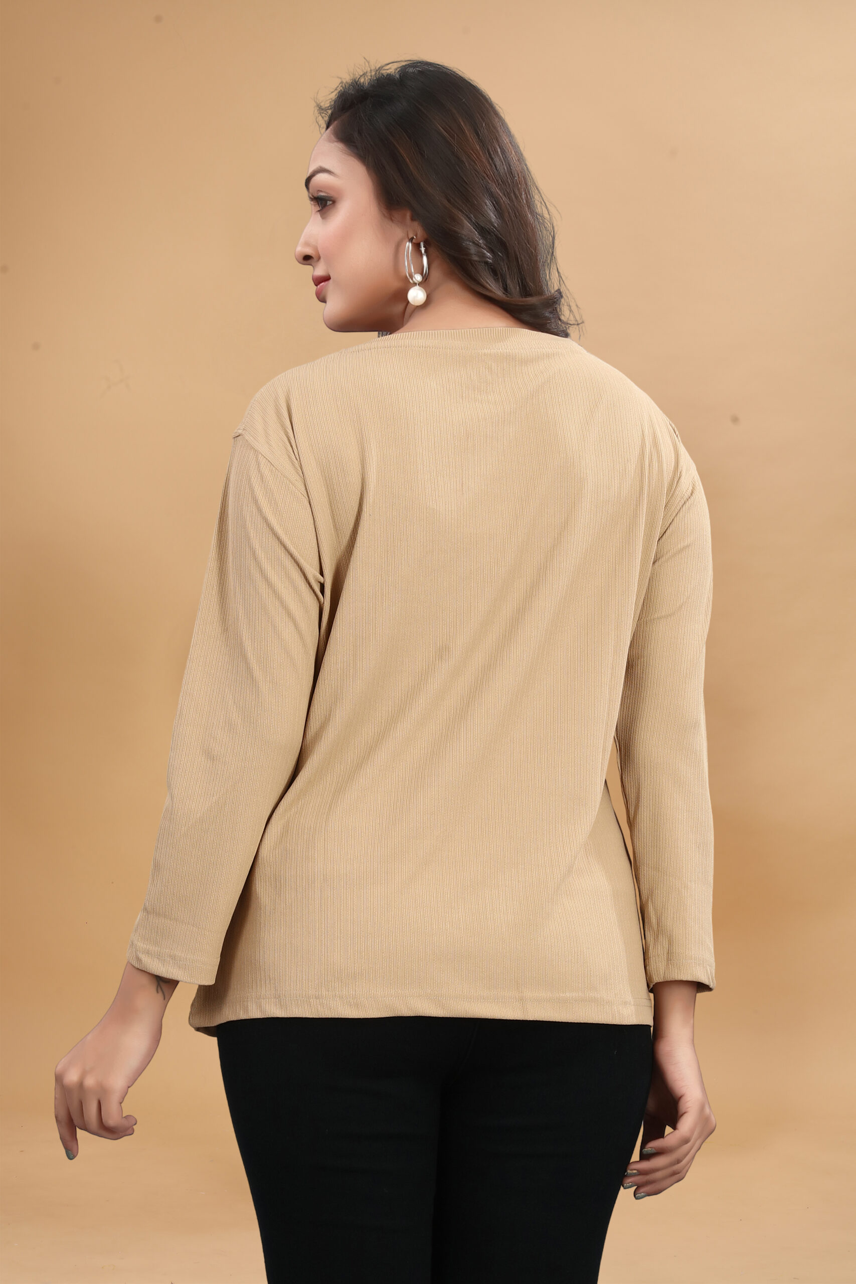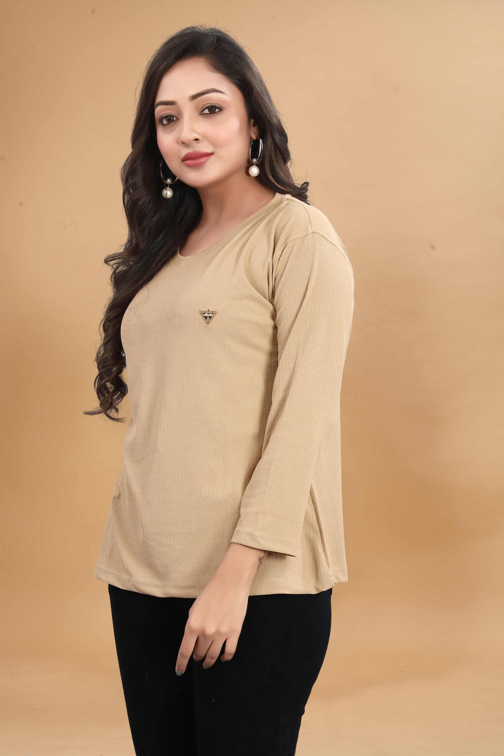 Elevate your casual look with this stylish lavender ribbed knit T-shirt. Designed for comfort and everyday wear, this T-shirt features a soft, stretchable fabric that feels gentle on the skin. The full sleeves and round neckline offer a timeless silhouette, while the subtle metallic logo badge on the chest adds a touch of elegance. Pair it with jeans, jeggings, or skirts for a versatile and chic ensemble.